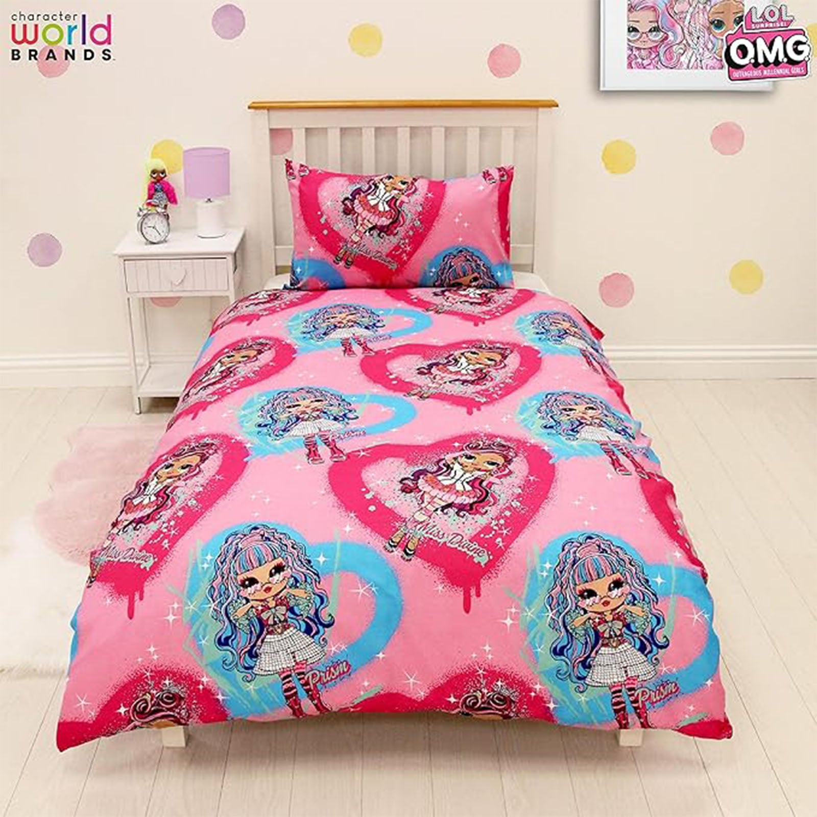 Prism and Miss Devine are here on this L.O.L. Surprise! O.M.G. single duvet set. Prism is all about music! She loves to rock out and wear edgy fashions. Miss Divine is all about art! She’s inspired by nature and loves being creative In a repeating pattern this duvet is ideal for fans of the dolls.