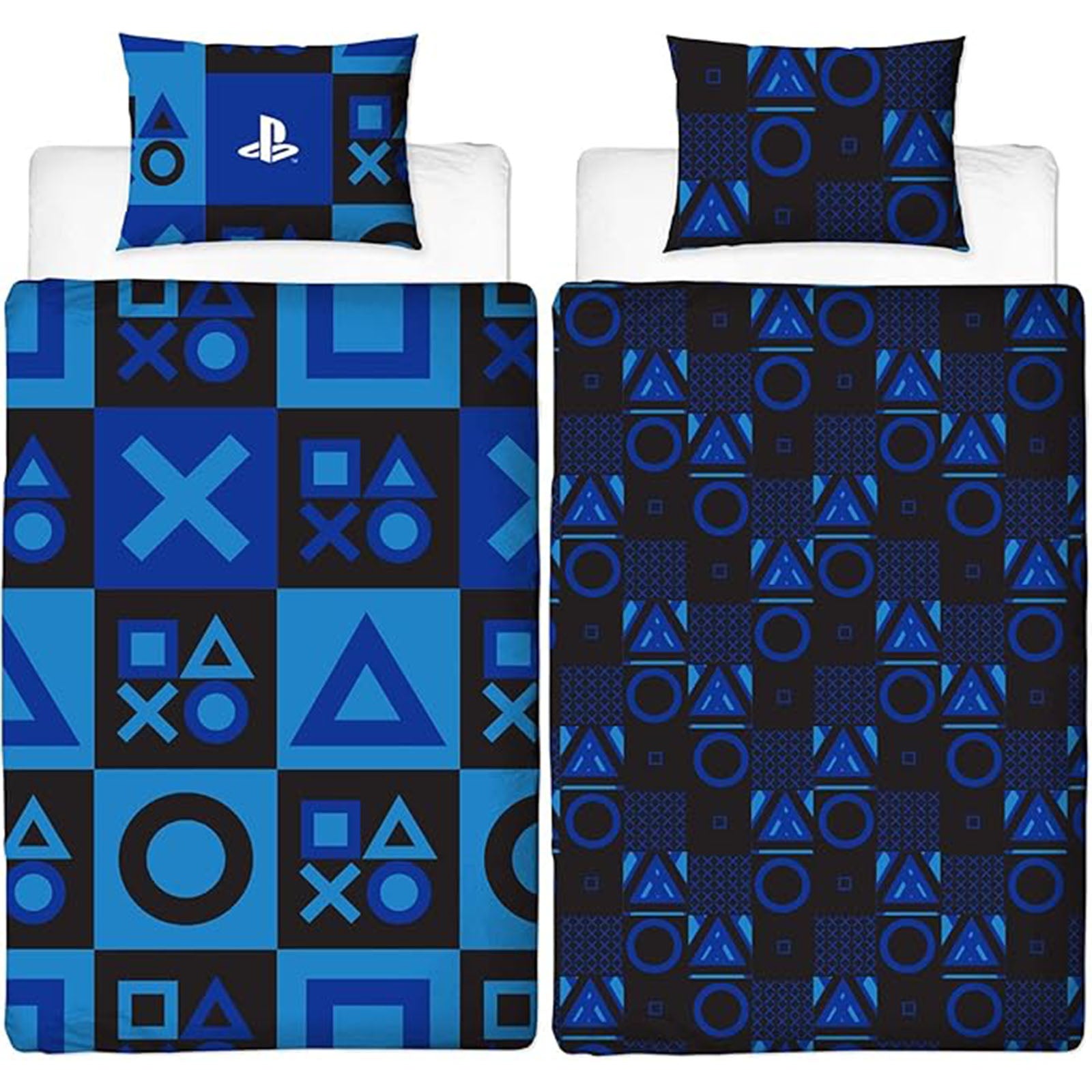 This Duvet cover features the Iconic Playstation Controller Icons in a check style pattern on Playstation Blue background.Flipping it over will reveal an alternative version of the controller icon repeat pattern, meaning you get 2 great designs in one, the perfect addition to any Playstationer's bedroom